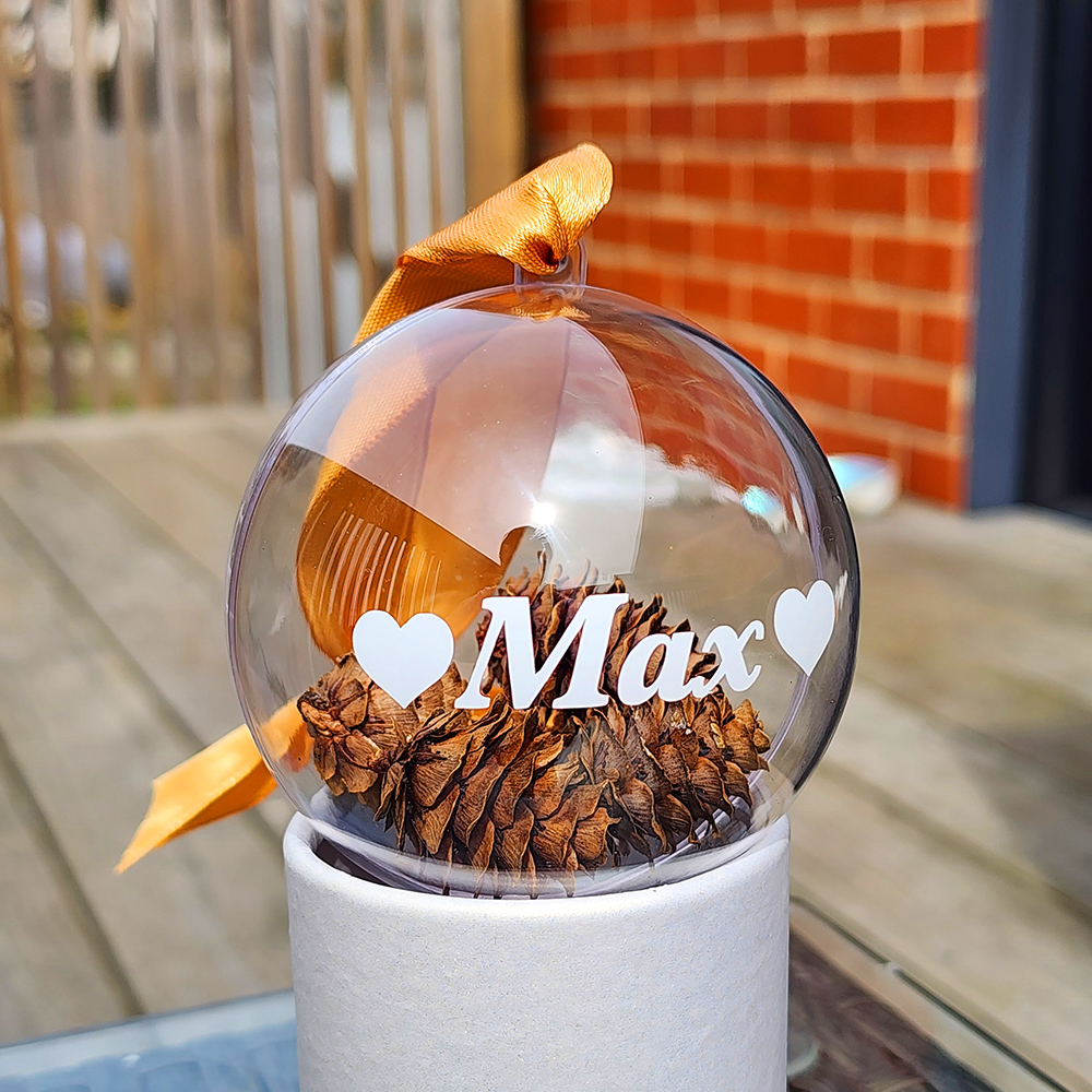 Ready-to-hang clear bauble filled with pine cones and personalised with your family/friends names.