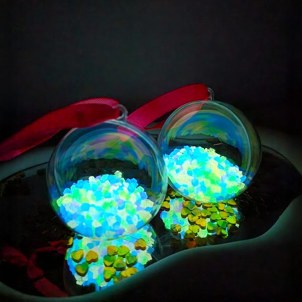 Made with a 6 cm bauble and filled with glow-in-the-dark particles.