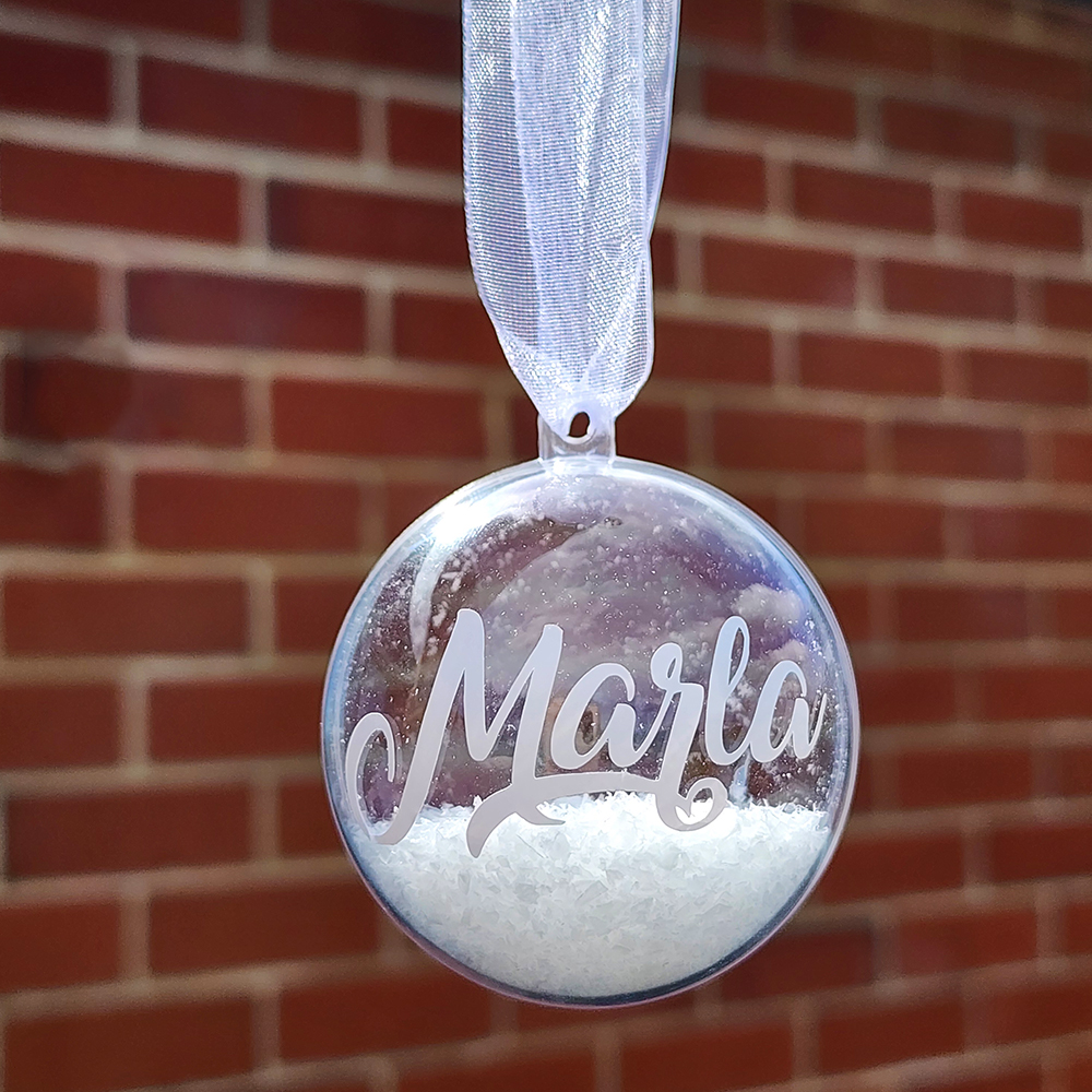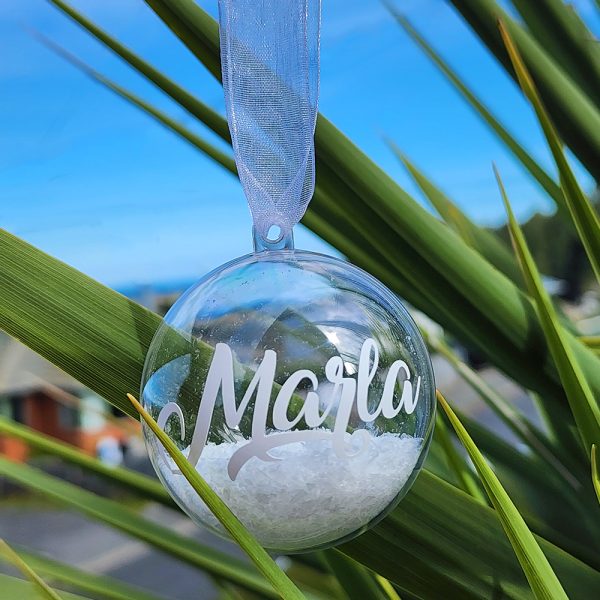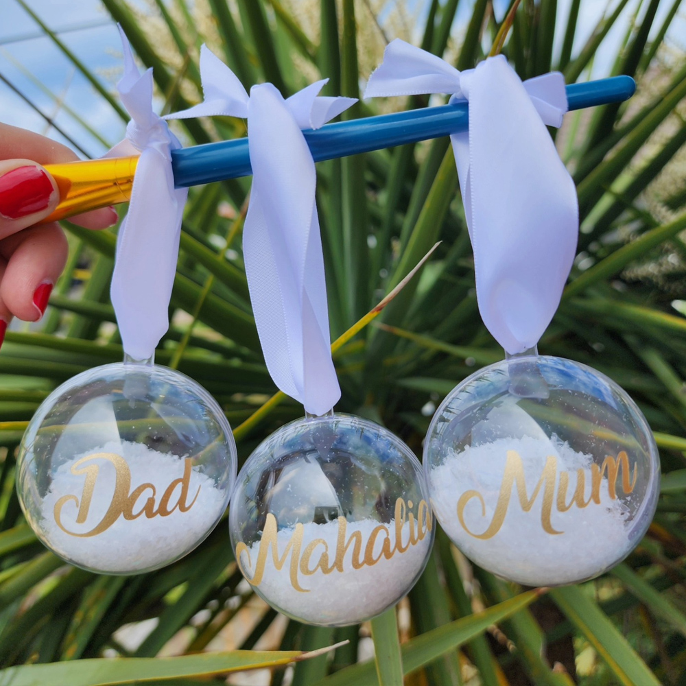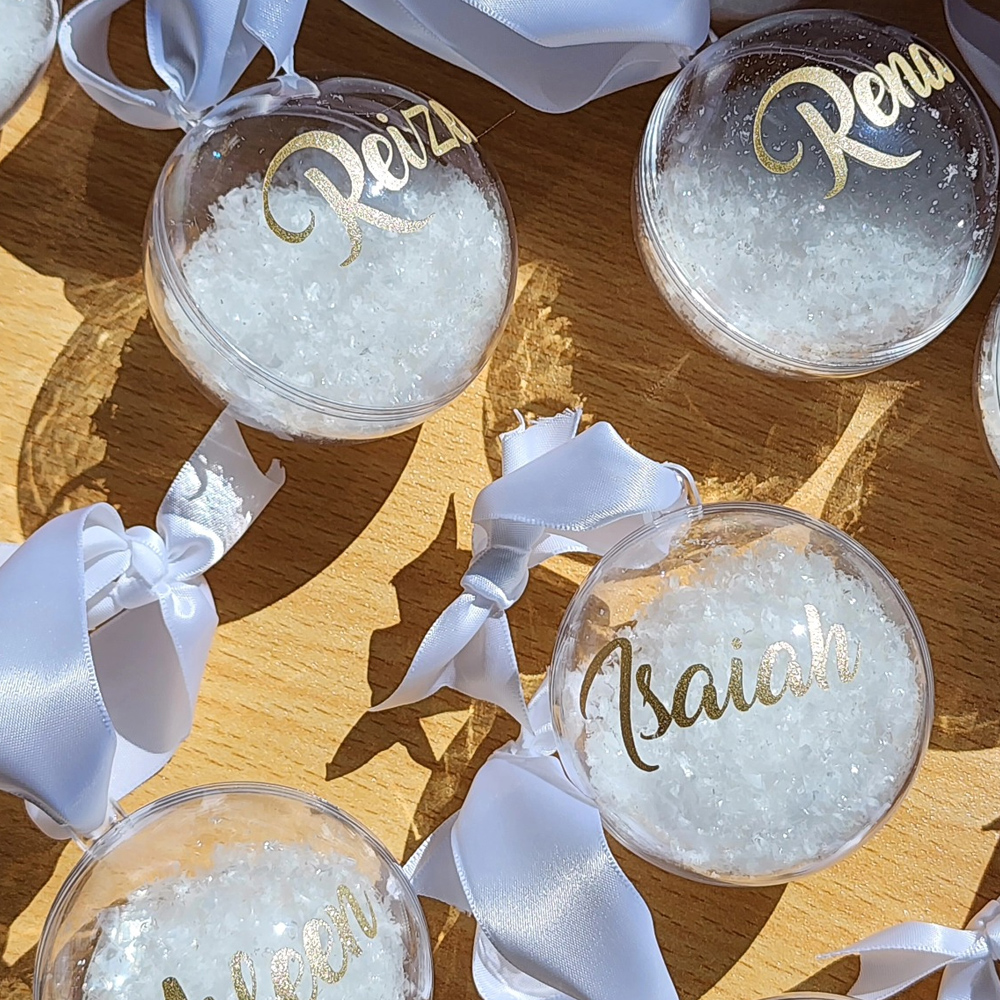 Snow Christmas baubles personalised with your name or the name of your loved ones.